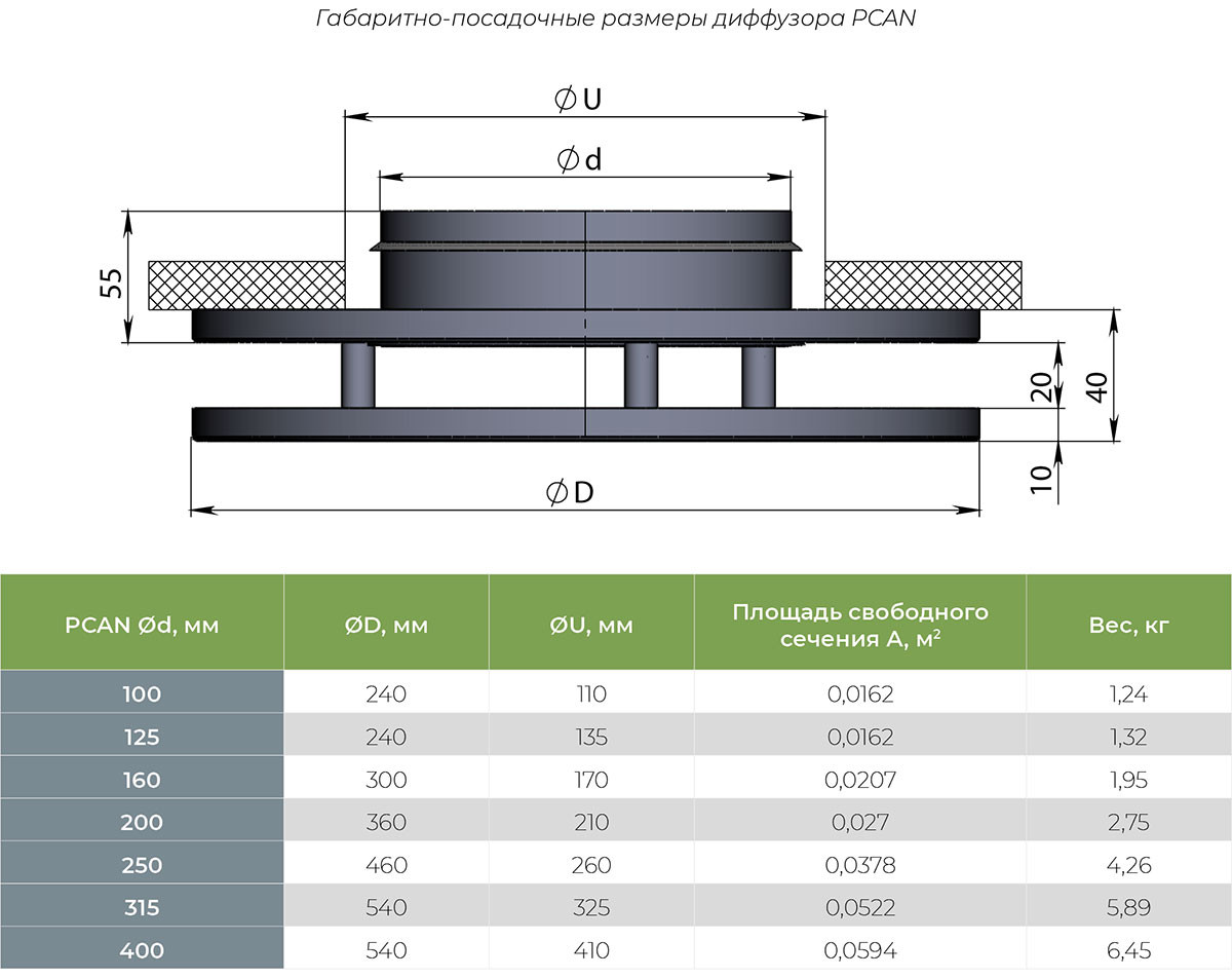 Диффузоры изготавливаются из оцинкованной листовой стали толщиной 0,9 мм и по умолчанию покрываются полимерной порошковой краской белого цвета RAL 9016M (матовая). Камера статического давления по умолчанию поставляется без покрытия. По запросу возможна окраска в любой цвет по международной шкале RAL как лицевой панели, так и камеры. Заказать камеру статического давления для диффузора PCAN.
